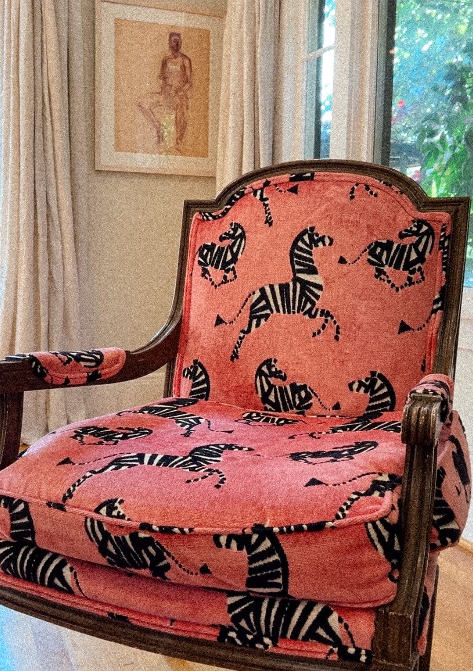 Note: When we moved to Portland and were waiting on movers to arrive with our furniture, we scored two insanely comfortable armchairs for $40 each, had them reupholstered in pink zebra velvet. They are my favorite.