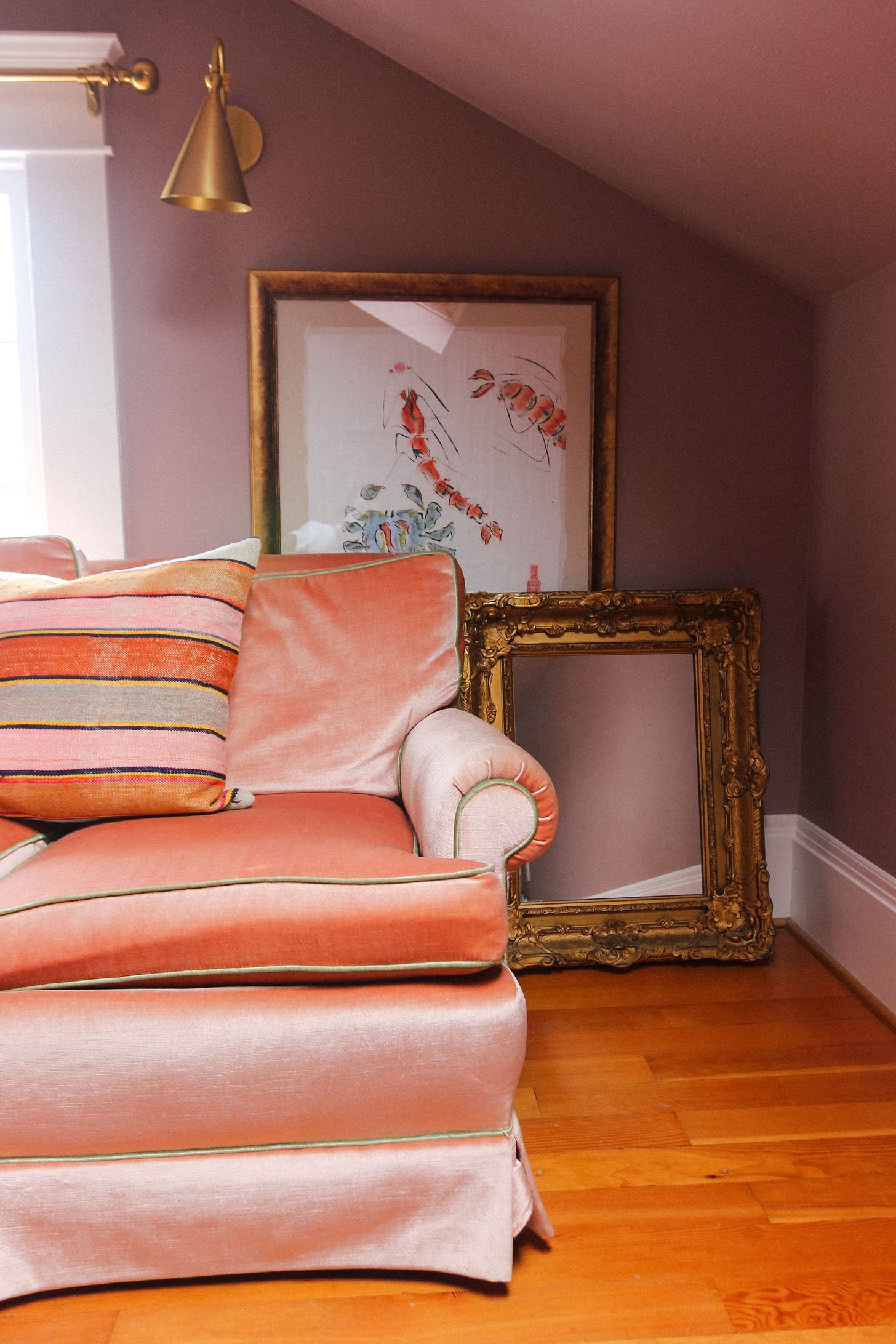 Something with great color or pattern, minimal wear, and a solid frame. These are the wins that require zero extra work. Just haul it home, clean it, and enjoy. This is exactly what we did with our pink velvet sofa trimmed in mint green piping.